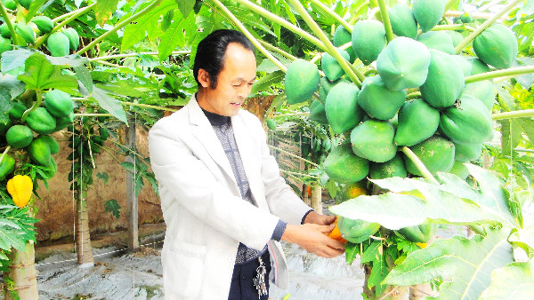 永靖县罗川台日照充足,对于发展蔬果产业十分适宜。为此,罗川台引进了10亩利用价值较广、经济效益可观的新绿色食品??木瓜。图为种植户采摘成熟的木瓜准备上市。