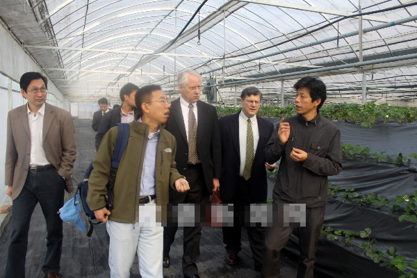 近日,来至美国佐治亚州州立大学的詹姆斯副校长和乔治教授,在省科技厅和市科技局的陪同下,考察了下涯镇红群草莓专业合作社的草莓休闲观光立架栽培展示基地。并且就他们的科研成果“利用生物酶技术保鲜水果”,在草莓保鲜应用的可能性进行了探讨。