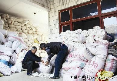 芮城县陌南镇夭头村是个种植棉花大村,全村共种植了6000余亩棉花,目前虽然到了收获季节,但棉农们却无论如何高兴不起来。该村村民孙代民告诉记者,他种植了50亩棉花,由于今年雨水太多,导致产量下降,每亩地所产籽棉也就是150公斤。如果放在去年,这些棉花已经卖得差不多了,而今年至今却一点也没卖出。“去年棉花刚一采摘,马上就有人上门收购,村子里到处能看到收购人员,今年就不同了,到现在没有看见一个收购棉花的。我家里现在堆积了1万余斤棉花卖不出去,真是愁死人了。明年我无论如何不种棉花了。”