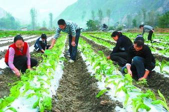 文县尚德镇村民在菜地进行田间管理。文县利用距九寨沟景区较近的优势,在尚德、石坊等乡镇大力发展蔬菜产业,农民收入大幅增加。