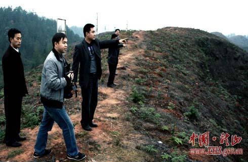 油茶基地负责人向县经信局负责人介绍新栽油茶树生长情况