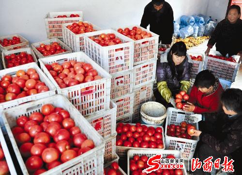 11月22日,永济市城西街道西姚温村农民正在将大棚西红柿装筐外运。近年来,永济市积极鼓励农民发展设施蔬菜种植等高效农业,并依托农民合作社等组织来促进高效农业向专业化、规模化等方向发展。截至目前,该市已发展设施蔬菜1.3万亩,仅此一项年可增加农民收入5000余万元。