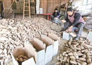 楼塔镇种植大户楼云然今年种植的100多亩高山番薯获得丰收,平均亩产达到1000公斤以上。由于管理科学和地理环境好,楼云然种植的番薯不但口感好,而且营养价值高,因此,深受市场欢迎。到目前为止,已有7000公斤番薯可售。图为昨日下午,老楼夫妇在过秤装箱。