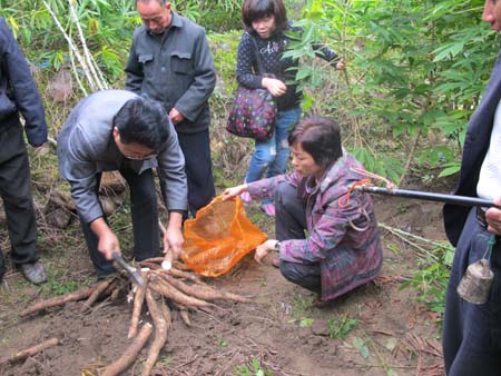 古碧教授一行深入到大田县均溪镇福塘村、文江乡等乡镇,针对当地木薯副产品综合利用开发情况进行考察调研,对木薯新品种(品系)实地取样,并走访了聚祥(大田)淀粉加工企业。在均溪镇福塘村木薯秆栽培食用菌种植大户陈飞虎的基地里,古教授认真仔细查看了生产情况,当他了解到木薯秆已有部分或全部替代传统原料,并已拓展到烟秆、玉米芯等原料,成功栽培了金针菇、黑木耳、杏鲍菇、平菇等6个品种时,给予充分的肯定。并要求把该项技术在体系内和体系外多加宣传,扩大应用面。同时古教授对试验产量排前10名品种(品系)进行了田间实地取样,并亲自指导农户生产。