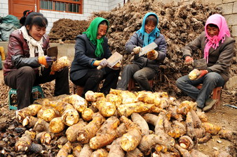 11月28日,宕昌县阿坞乡各革村一社的几名群众正在帮助药材种植户陈平加工刚刚采挖的中药材――大黄。近年来,宕昌县把中药材产业作为农业特色产业的主导产业来抓,全县中药材种植面积达到36.2万亩,预计实现产值近3亿多元,成为农民增加收入的重要渠道。