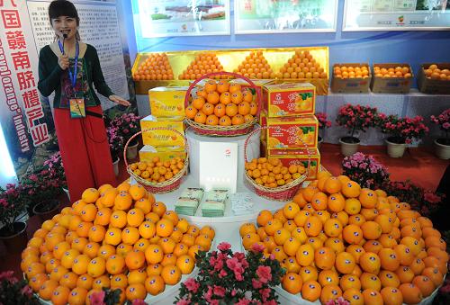 11月29日,在第三届中国赣州国际脐橙节展销会上,一名工作人员在介绍脐橙。