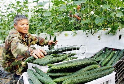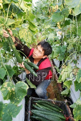 12月5日,在江西省德兴市张村乡无土栽培科技大棚,农民正在把现摘黄瓜装框,准备运往当地的订单超市。