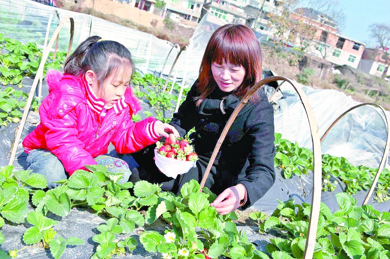 图为12月4日游人在建宁县濉溪镇将屯现代农业示范园区甜蜜蜜草莓合作社基地采摘草莓。近年来,该镇引导农户加入草莓合作社,并提供统一的种植管理技术,统一销售模式,使农户抱团发展。目前合作社有基地10多亩,产值可达30多万元。