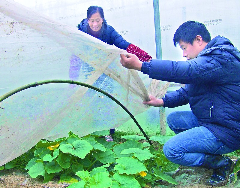 12月8日,在建宁县溪口大棚蔬菜基地,农技干部帮助菜农为蔬菜加盖薄膜。针对目前的低温天气,建宁县组织100名农技干部深入田间地头,为农民讲解冬种作物、畜禽养殖的防寒保暖常识,指导农户做好防寒措施,防止低温冻害。