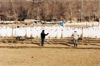 12月12日,宕昌县哈达铺镇召藏村群众凉晒马铃薯粉条。2011年该县马铃薯种植面积达到30.2万亩,平均亩产量超过1600公斤,总产量预计达到48万多吨。马铃薯产业己成为农业增效、农民增收的重要渠道。