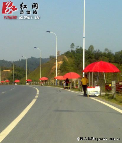 近日,记者在长株潭芙蓉大道湘潭临近长沙路段看到,附近农户将自家种植的草莓摆上道路沿线叫卖。记者粗略估计,500米长的路段约有30个摊贩,芙蓉大道俨然成为“草莓路”。