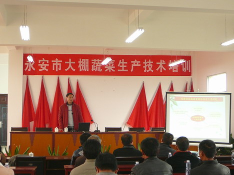 为提高永安市大棚蔬菜栽培水平,日前省农业厅在小陶镇、贡川镇及大湖镇举办3期大棚蔬菜生产技术培训班。培训由省农业厅土肥站土壤科科长黄功标带队,特邀省农科院作物研究所研究员薛珠政及省农林大学林碧英副教授授课。全市14个乡、镇(街道)新农村建设服务中心干部,部分村农技员、蔬菜种植大户和果蔬合作社代表近200人参加了培训。