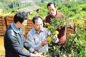 在延平区坎下果场,南平市农委科技特派员、高级农艺师魏学贵(中)正在为果农果商推广桔中贡品――瓯柑的越冬和保鲜技术。瓯柑具有抗高血压、糖尿病和抗癌等多种药用价值,近些年产品供不应求。
