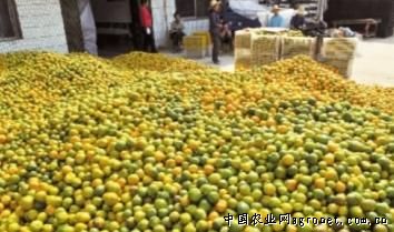 今年柑橘大丰收,产量都达到了去年的两倍以上,许多水果商反映柑橘卖不动。图为一水果批发商门前摆放了大量未销售出去的柑橘。