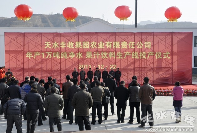 12月22日,天水丰收果园农业有限责任公司年产1万吨纯净水、果汁饮料生产线项目投产仪式在秦安县隆重举行。秦安县委常委、纪委书记杨仁义,副县长张辉元,甘肃东煜集团党委书记、常务副总裁王和平,副总裁王辉及县直有关部门负责人出席投产仪式。