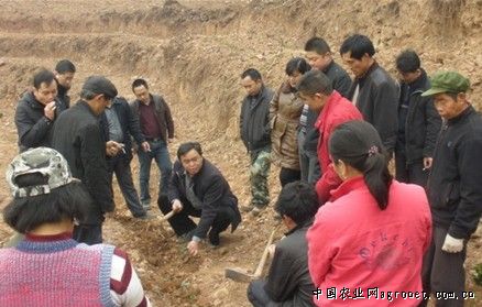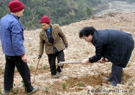 山枣乡党委书记、乡长张建军为茶农示范茶苗种植