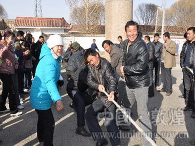 此次敦煌市阳关镇农民趣味运动会,共设拔河、猜谜、乒乓球、篮球、跳绳、抽奖、定点投篮等7个项目。活动中,大家比“眼力”、比“实力”、比“智力”,还要比“协调能力”、比"“同心协力”,在场的观众们不断地为选手们呐喊助威,叫好声充满整个运动场。场上你争我夺,场下欢笑不停,平时的庄稼汉摇身一变成为了运动场上的大明星。