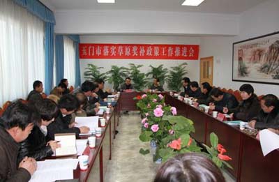 近日,玉门市落实草原生态保护奖励补助机制政策工作推进会在市政府会议室召开。市人大副主任宋成虎主持会议,市政府副市长曹彦军作重要讲话。市直有关部门负责人和项目实施的八个享受补奖政策的乡镇乡镇长及分管乡镇长、市畜牧兽医局局长、副局长共计40余人参加会议。