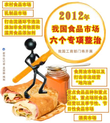 2012年,工商部门将开展农村食品市场,乳制品市场,打击流通环节违法添加非食用物质和滥用食品添加剂,食用油市场以及打击非法经营“地沟油”,重点食品品种和重点区域、重点场所食品经营以及季节性、节日性食品市场、酒类市场等六个专项整治执法行动。