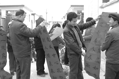 成县店村镇新村村民领到了喜庆的春联。今年,成县“三下乡”服务队深入乡镇村社,把对联、年画等送到了群众家门口。本报记者吴庭栋摄