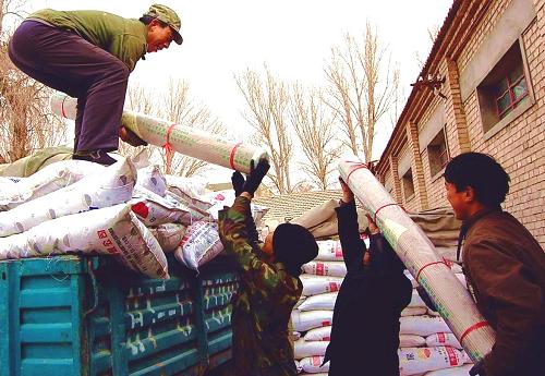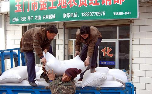 1月19日,玉门农民在农资市场将购买的化肥和地膜装车。近日,甘肃省玉门市调进了化肥、农药、种子、地膜等农用生产资料450吨,在春节前投放到农资市场,玉门农民积极备办农资,为春节后的春耕作准备。新华社发(万宗平 摄)