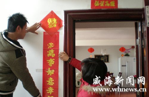 周彩红与儿子一起在新房门口贴春联。(记者 李晓岩 摄)
