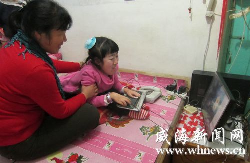 除夕夜,张小乐在母亲的陪伴下,通过网络给残疾人网友拜年。(记者 张英娥 摄)