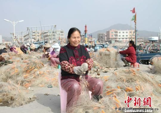 在冬古村前渔港,一大群渔家妇女正在解取绫网上的鱼蟹