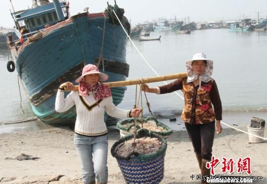 在冬古村前渔港,渔家女正在抬鱼上岸