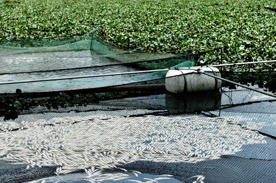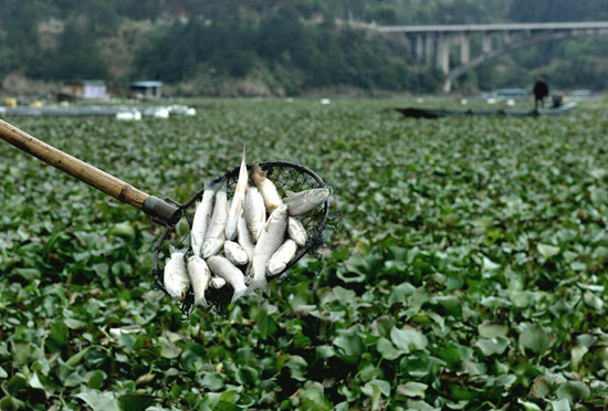 2012年1月31日,闽江福建古田县水口镇湾口村段,因缺氧死亡的一网鱼苗。