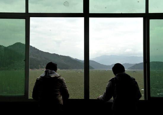 2012年1月31日,闽江古田县水口镇湾口村被水葫芦侵蚀的江段,两位村民站在屋子里眺望如同草原的江面。