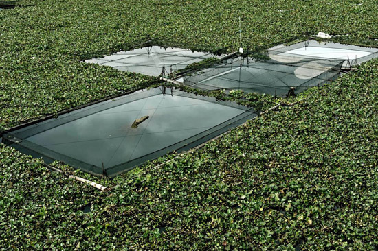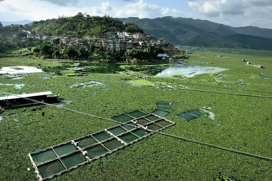 2012年1月31日,闽江古田县水口镇湾口村段,被水葫芦侵蚀的网箱。