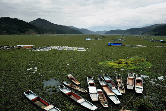 2012年1月31日,福建宁德市古田县水口镇湾口村段,浩浩荡荡的水葫芦延绵闽江近10公里,如同草原。2011年,该镇400多养殖户的网箱遭遇大面积死亡现象损失上亿元,今年养殖区又遭水葫芦围困鱼苗都无法放养。