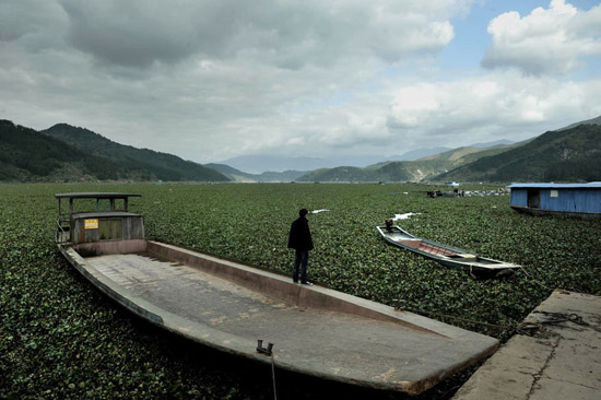 2012年1月31日,闽江古田县水口镇湾口村被水葫芦侵蚀的江段,一位村民站在船上眺望如同草原江面。