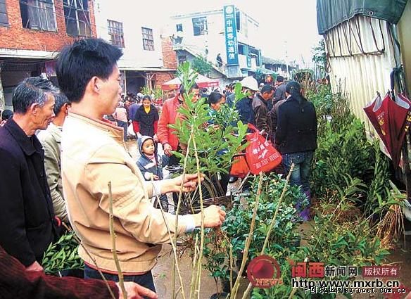 1月31日,正值连城县四堡乡圩集日,许多农民在购买果苗。四堡是远近闻名的水果之乡,农民们每年都要增种大量果树,因此,春节还未过完,农民们就开始进入“发新春”了。