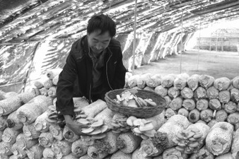 近年来,宕昌县大力发展设施农业,食用菌产业成为农民增收的新亮点。图为南阳镇设施农业示范园内一农民采摘蘑菇的情景。