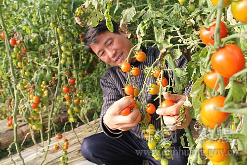 2月1日,敦煌市月牙泉镇村民余尚团正在高效节能日光温室中采摘樱桃小西红柿准备上市出售。去年他种植的2座、1.3亩温室收入3万多元。今年元月份以来,敦煌市的12235座、9982亩高效节能日光温室里的西红柿、黄瓜、辣椒等反季节蔬菜纷纷上市,鼓了农民的“钱袋子”,丰富了市民和旅游市场的餐桌子。