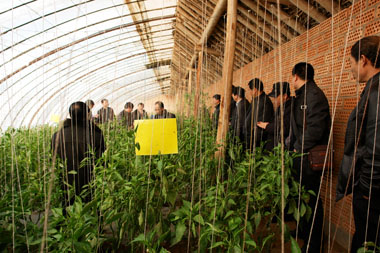 2月2日,高台县农业委员会组织专业技术人员20多人,在宣化镇王马湾村和利号村进行了温室增温新技术现场观摩培训。观摩人员分别参观了温室内墙多孔砖增温技术示范、温室内墙石棉瓦增温技术示范、温室墙体刷黑增温技术示范,农业委员会专业技术人员对这几种增温技术分别进行了细致的讲解,同时还与部分菜农进行了深入的互动交流。