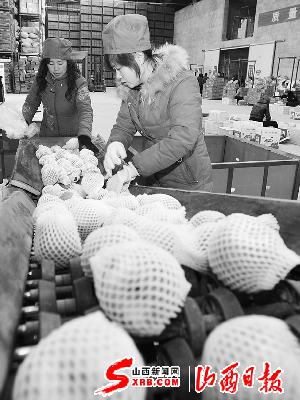 2月16日,吉县大山农副产品有限公司,工作人员正在生产线上分装苹果。该县立足苹果产业转型发展,积极鼓励营销企业兴建大型产业苹果交易市场,推进果品深加工项目建设,延伸产业链条,大大提高了产业效益。
