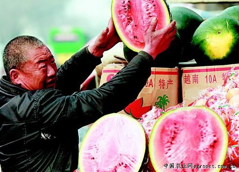 昨日,省城解放路旁,水果商贩将西瓜“解剖”后摆放,来吸引消费者。随着天气转暖,各种反季节水果纷纷上市,但由于价格昂贵,购买者寥寥无几。