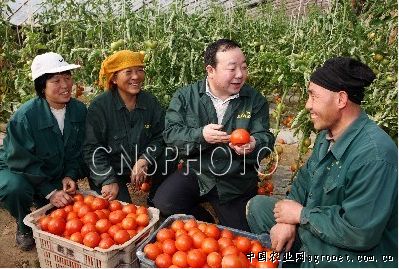 山西省盂县鑫升种植专业合作社经理王爱军(右二)与部分员工在蔬菜大棚内就当日上市的西红柿如何保鲜交流经验。该专业合作社建设新型高效节能日光温室120余亩,安排60多位农民就业,以绿色无公害农产品为品牌,发展有机大棚蔬菜生产,种植的黄瓜、油菜、西红市、北瓜等蔬菜品种,采用“合作社+订单农业+标准化有机蔬菜生产”的模式,使当地农民一年四季种植的蔬菜都能上市销售创收。