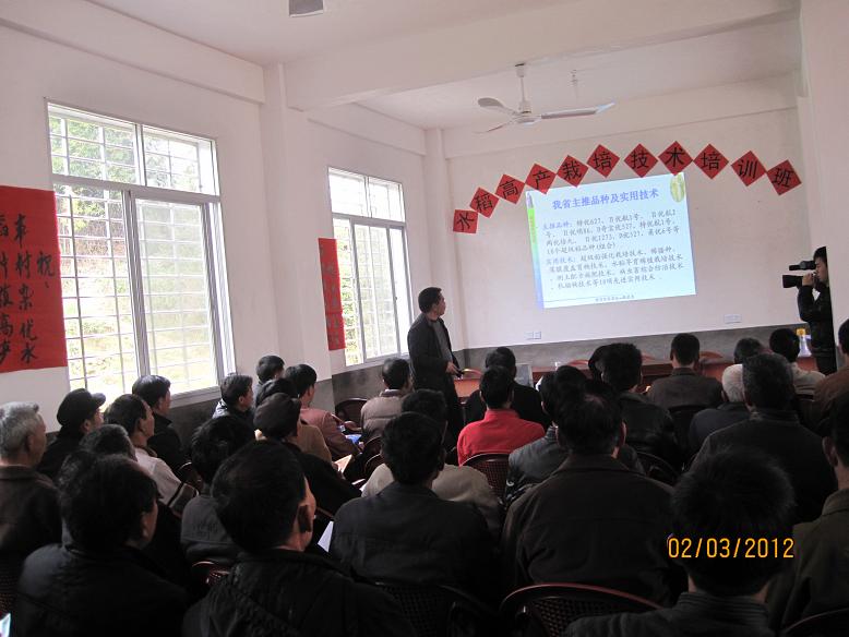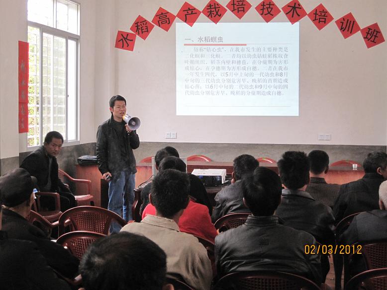 3月2日,南安市农业与海洋局组织农技、土肥和植保等专业技术人员深入金淘镇水阁村早稻高产创建示范片,举办早稻高产创建技术培训班。参加培训班的有镇、村农技员、高产创建科技示范户和种植大户等70多人。培训会上农技、土肥和植保等技术专家图文并茂、生动形象地讲解了“超级稻高产栽培技术”、“测土配方施肥技术”和“水稻病虫害综合防治技术”等农业增产技术。培训会上,广大群众还针对水稻高产栽培、测土配方施肥技术和水稻病虫害综合防治技术踊跃提出问题,农技人员深入浅出地给予答疑释难。在这春耕春播的大好时节,农技人员及时送科技下乡,普及农业科技,受到了广大农民朋友们一致好评。