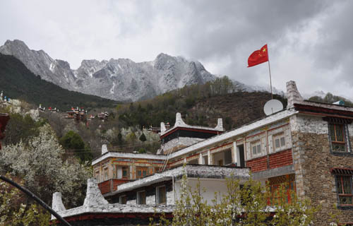 在甲居藏寨中,只要登上任何一家“藏家乐”的露台,都可以仰望到雪山。