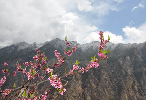 从甲居藏寨可以眺望河谷对岸,怒放的桃花与远处的雪山形成了春与冬交织的旋律。