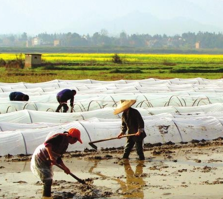 武冈市种粮大户肖洪武通过土地流转,今年种植2300亩早稻,全部机械化育秧。他说是中央一号文件使他大胆选择全部机械化育秧插秧。图为4月1日,工人们正在实验田播种盖膜。