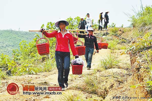 武平县十方镇高梧村金鸡岭的桑葚正值采收季节,果农纷纷上山采摘桑葚回基地待售。十方镇2010年在高梧村金鸡岭建立桑葚种植示范基地1056亩,该基地的建立既为果农提供了增收新渠道,又能有效防止水土流失。