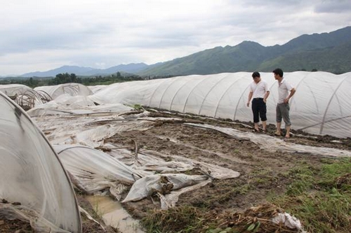 江华瑶族自治县农业技术人员查看被水冲毁的西瓜大棚
