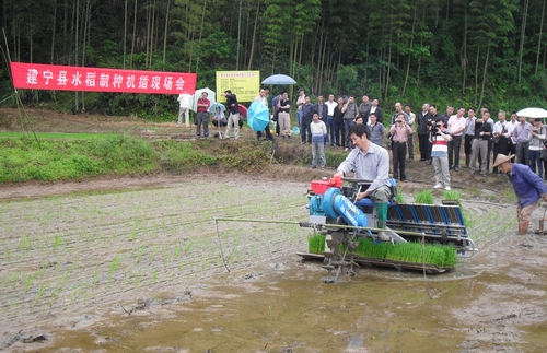 5月15日,福建省建宁农机中心在溪口镇枧头村召开2012年全县制种机插现场会,福建省农科院张琳研究员等人莅临现场指导,全县各乡镇制种大户、种粮大户、经销商、生产厂家代表、农机、农技相关技术人员合计70余人冒着蒙蒙细雨到现场观摩。现场会后,制种大户、种粮大户等人对机插秧效果给予肯定,纷纷表示要购买插秧机,并要求给予技术指导。
