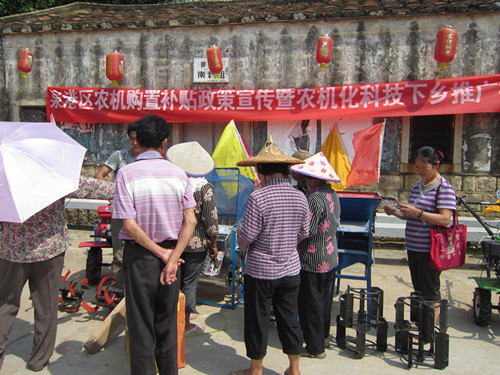 为深入贯彻落实2012年中央一号文件精神,进一步加大农机购置补贴宣传力度,确保国家支农惠农政策落实到位。5月15日,福建省泉州泉港区农机站农机人员到山腰普安村组织开展“农机购置补贴政策宣传和农机化科技下乡”活动,利用科技下乡展示脱粒机、插秧机、耕整机等补贴机具。