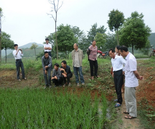 “我们这里的早稻禾苗基部全部变成红褐色啦,不知道是什么瘟疫……”,承担早稻集中育秧员阳光工程培训的桂阳县农广校中专部负责人接到了该县正和镇阳山村学员何正高的电话,按理说现在已是早稻分蘖盛期,无关集中育秧方面,但是学校领导经过紧急磋商,认为解决学员难题就是培训的延伸,决定立即请培训老师和专家赶往正和镇。通过田间仔细调查,分析,结论是二化螟危害叶鞘尚未“钻心”形成的基脚变红,现场剥叶找出幼虫,详细讲解发生条件、危害症状,消除村民关于“瘟疫”恐慌,同时发现稻纵卷叶螟、稻飞虱都非常严重,必须立即打药防治,综合防控,否则后果不堪设想。培训专家现场开出“药方”,重点说明用药量、防治最佳时期,学员们深受感动,纷纷赞叹:阳光工程真贴心,培训课堂不停步。